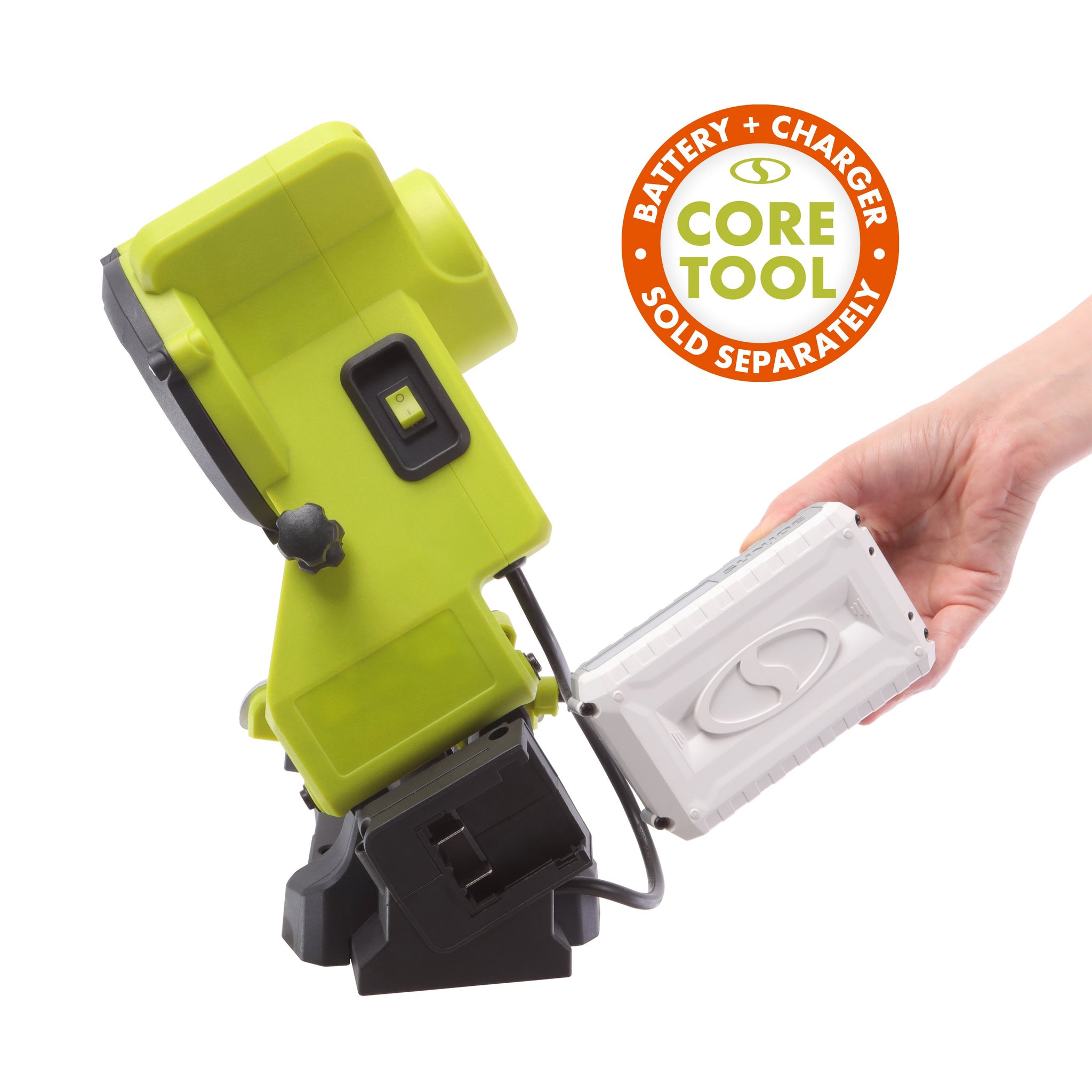 Dull chains are dangerous and difficult to work with, and taking trips to the hardware store to get them sharpened wastes time and money. So, next time your chain saw or pole chain saw pulverizes wood and can’t cut cleanly any more, reach for the 24V-CSSHRP-CT 24-Volt Cordless Chain Sharpener from SUN JOE®! Designed to work with virtually all saw chains, 24V-CSSHRP is the perfect tool to keep your chain in top cutting condition. Simply position your dull chain along the guide, set your swivel angle from -30º to +30º left or right, and use the 100 grit, aluminum oxide grinding wheel to keep your tool’s cutting teeth razor sharp! Adjust the grinding depth with a quick twist of the knob for a precise cut every time! The powerful 65.5 watt motor spins the grinding wheel at up to 6,500 RPM, sharpening your worn chains in less time and with less effort than manual sharpeners. The sturdy base mounts securely on any table or bench for maximum control during use. Plus, 24V-CSSHRP is perfect for use anywhere power is at a premium – with the cordless convenience of iON+: SUN JOE’s exclusive, eco-friendly 24-Volt lithium-ion battery system. And iON+ provides up to 40 minutes of rechargeable runtime with no-fade power + performance, and is compatible with Snow Joe + Sun Joe’s complete 24-Volt Cordless tool universe (Battery Sold Separately in Core Tool Version). So, skip the trip to the garden center and maintain your chain with the 24V-CSSHRP-CT 24-Volt Cordless Chain Saw Sharpener from SUN JOE. GET EQUIPPED®.