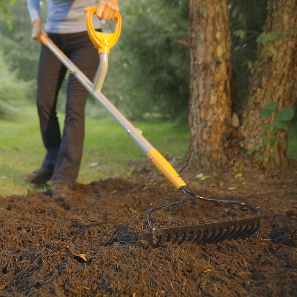 Make yard work easier on yourself with this innovative rake. The added handle that connects to the steel shaft helps reduce the strain on your body so you can work longer. And the 16 steel tines make it easier to rake rougher debris. That's the smarter way to do yard work. By Sun Joe.