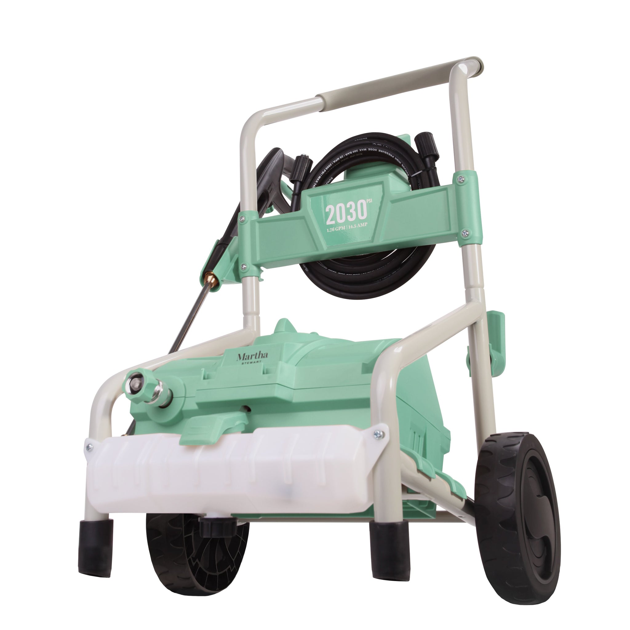 Take on your toughest home, outdoor, and auto cleaning tasks with ease thanks to the MTS-2030-PW Electric Pressure Washer by Martha Stewart. With 1800 watts of pure pressurized power, the 14.5-amp motor generates up to 2030 PSI to eliminate every last bit of dirt, grease and grime. With the five included Quick-Connect tips and onboard detergent tank you can easily go from an intense jet to a gentle, soapy spray to suit all of your cleaning needs. Featuring Pressure-Select Technology, the MTS-2030-PW lets you pick the perfect pressure to tackle the most challenging cleaning chores with professional results. With easy-glide wheels, an extension wand, and 20-foot high-pressure hose, you’ll spray away your outdoor cleaning chores in next to no time.