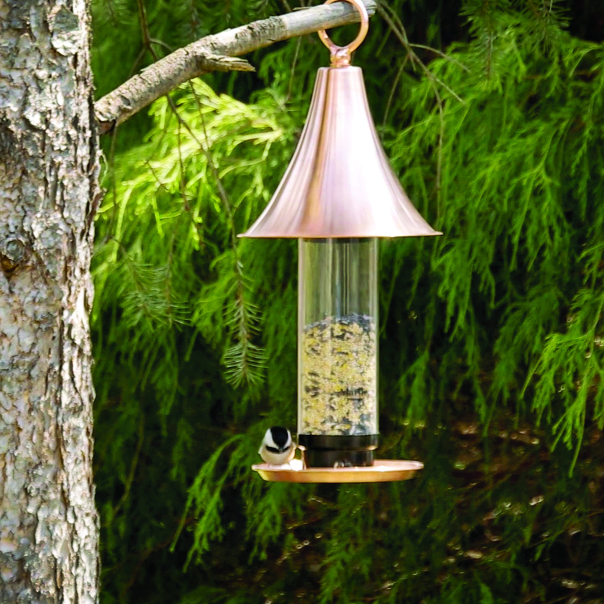 Give your birds only the best with the ultimate, high-end habitat designed to keep your fine-feathered friends fed, sheltered and dry. Birds will be flocking to your front lawn for the chance to eat at this handsomely designed feeder. Made of real copper and equipped with four feeding ports, this ideal bird buffet will bring a touch of luxury to any home, yard, or garden. The lipped feeding tray, with convenient, built-in drain holes, prevents waste, keeps seed dry and allows the perfect perch for your winged guests to comfortably dine. And the easy-to-clean and easy-to-fill feeder tube makes maintenance a breeze!
