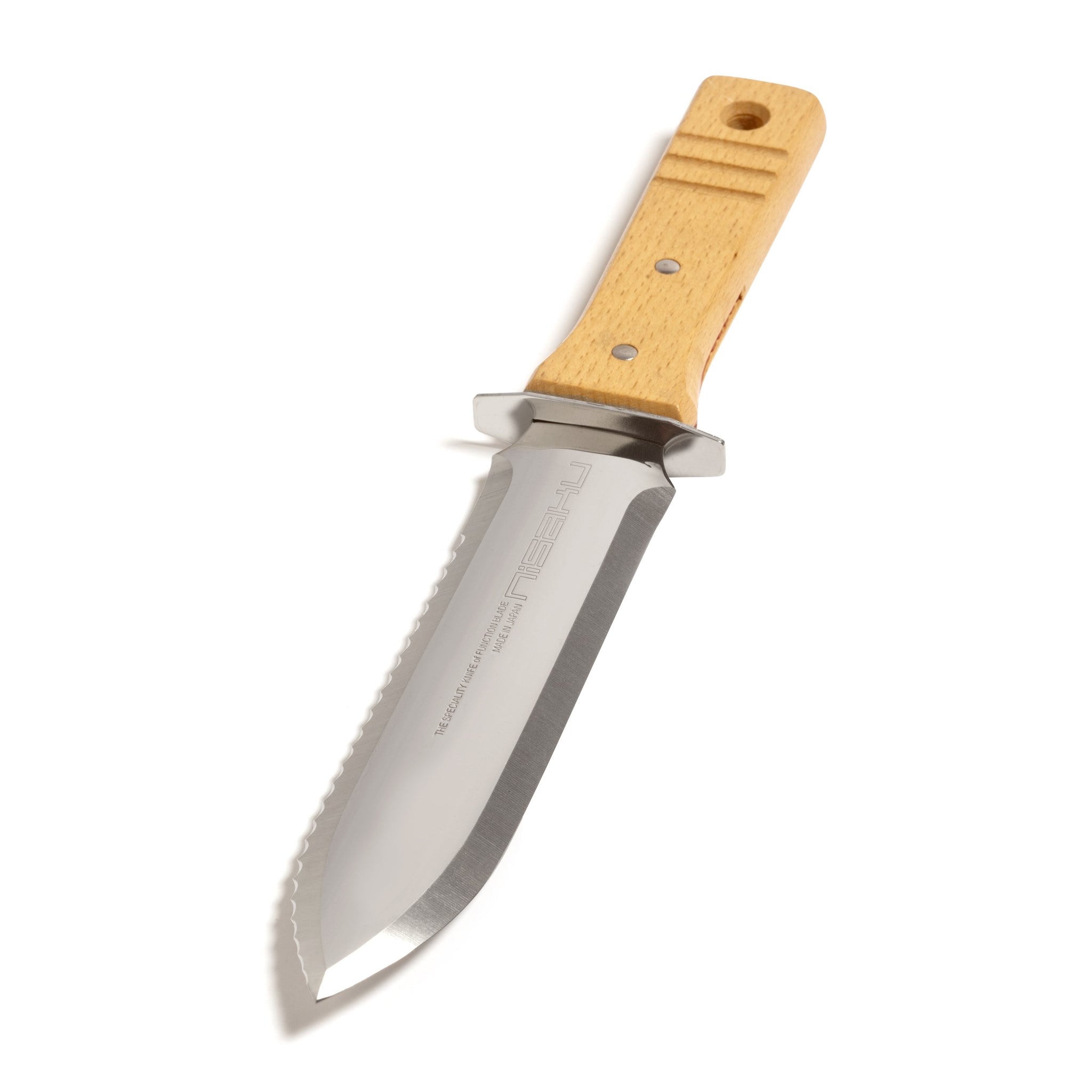 The Nisaku Japanese Stainless Steel Yamagatana Mokuetubatsuki boasts a serrated edge that's useful for dividing plants, planting bulbs, flowers and herbs, digging out weeds, removing rocks, cutting through roots and so much more! A comfortable wooden handle allows for a good grip for all-day digging, and ensures you push into the soil with more control. Comes with a leather sheath.