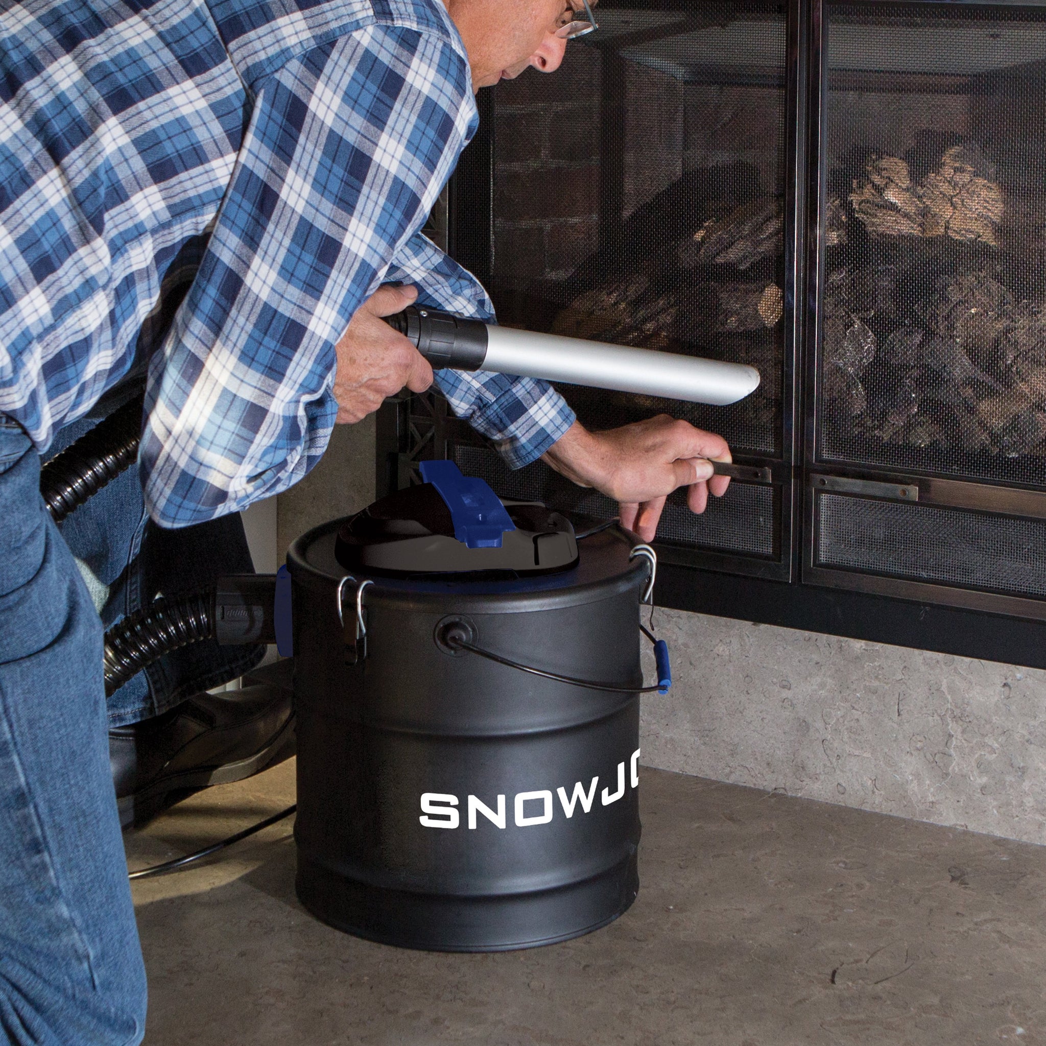 ASH IT OUT. The Snow Joe® ASHJ202E 5 amp 4.8-gallon Ash Vac is designed for cold ash pickup from wood stoves, pellet stoves, fireplaces, firepits, and BBQ grills. Equipped with a dual filtration system that employs both a coarse-dust pre-filter and a fine-dust pleated filter, the Ash Vac effectively traps dust particles during the ash cleaning process and prevents them from escaping into your breathing space. No more dusty mess around your home! Operation is simple: just insert the Ash Vac’s aluminum intake nozzle into your pile of cold ash, flip the switch, and watch its powerful 5-amp motor generate up to 500 W of suction power and 42.4 cubic feet per minute of air flow. The Ash Vac’s extra large metal canister stores up to 4.8 gallons of ashes, so you can finish your task without stopping to empty the container. Plus, it’s a self-contained, bag-free system, which allows for easy ash removal with a simple lift of the container lid. Other features include a safety stop switch to prevent the Ash Vac from operating without a properly fitted filter, a wire filter basket to protect the fine dust filter, an easy carry handle, an inspection window blockage indicator, and an onboard cord/hose organizer for convenient storage. Backed by a full 2-year warranty, the Ash Vac ASHJ202E is the reliable cleanup tool you’ll need to deal with any ash problem in a simple, clean and safe way.