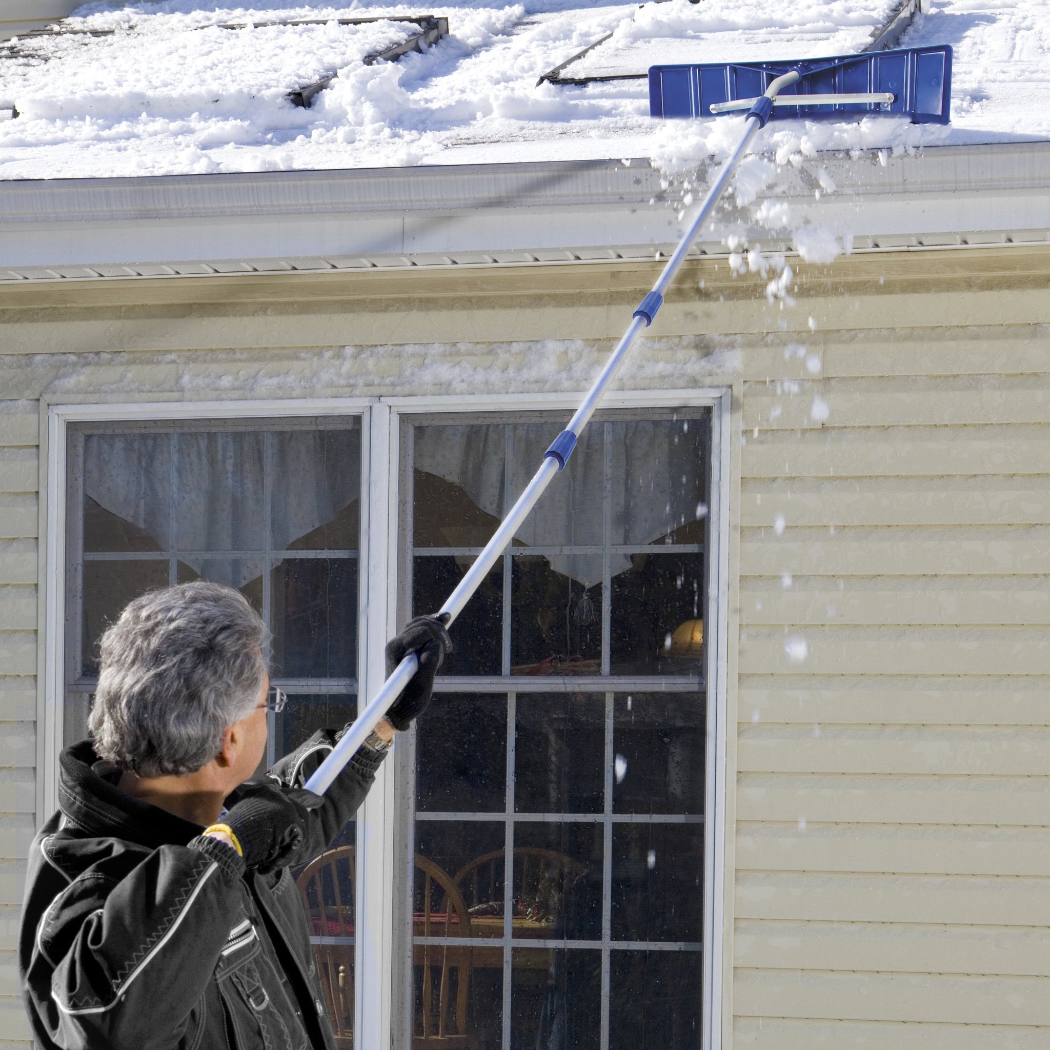 ROOFER JOE to the rescue. Prevent damage due to the heavy snow loads piled onto your roof and save on costly repairs with ROOFER JOE – a handy, easy-to-use and affordable roof rake that quickly lets you remove snow, wet leaves and other debris from your roof while standing safely on solid ground. Roofer Joe Model RJ204M-RM boasts an innovative Twist-n-Lock telescoping pole that quickly and easily adjusts from 6.2 feet to a whopping 21 feet for even greater overhead reach. At only 4.8 lbs, Roofer Joe is ultra-lightweight, durable and easy to handle. Its oversized poly blade rake head measures 6-inches wide by 25-inches long for maximum clearing power. Get Equipped® for winter cleanup with Roofer Joe and defend your home when winter strikes.