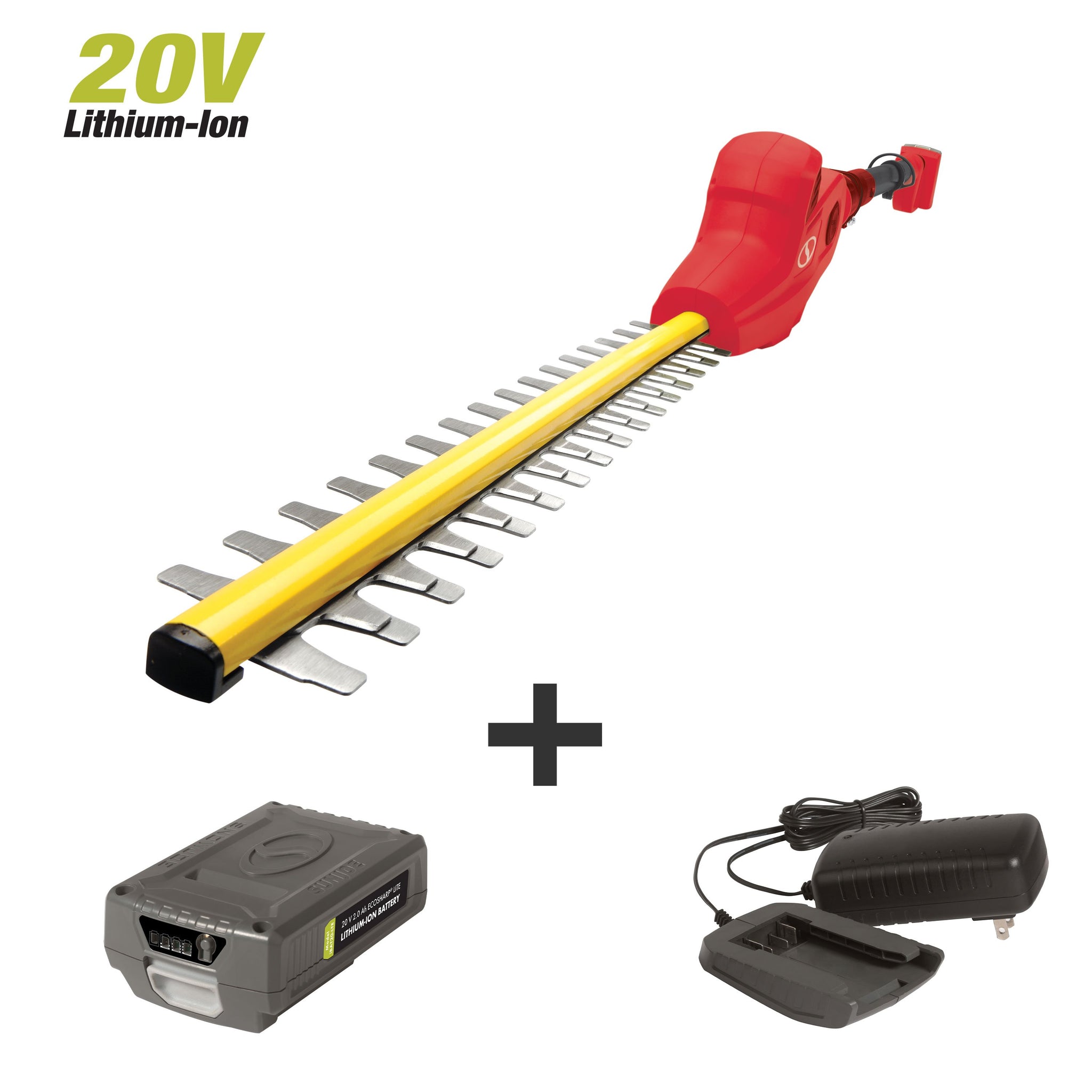 SUN JOE's multi-angle pivoting head allows for precise trimming of most tall bushes and hedges. 20ViONLT-PHT17-RED's 17-inch dual action, rust-resistant steel blades cut efficiently in both directions, and the telescoping pole adjusts from 6 ft to 7.9 feet for up to 12.5 feet of overhead reach. And when you’re ready to go low, simply pivot the head and point the pole down to work beneath the bushes.