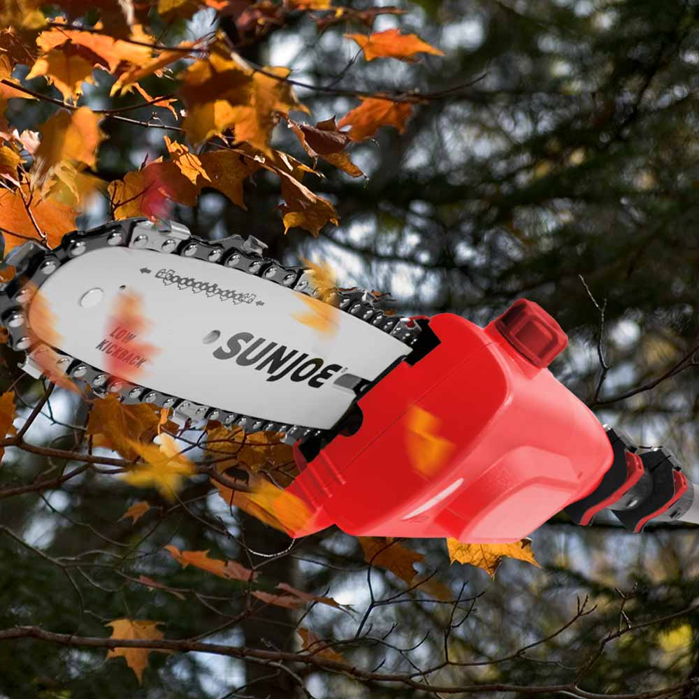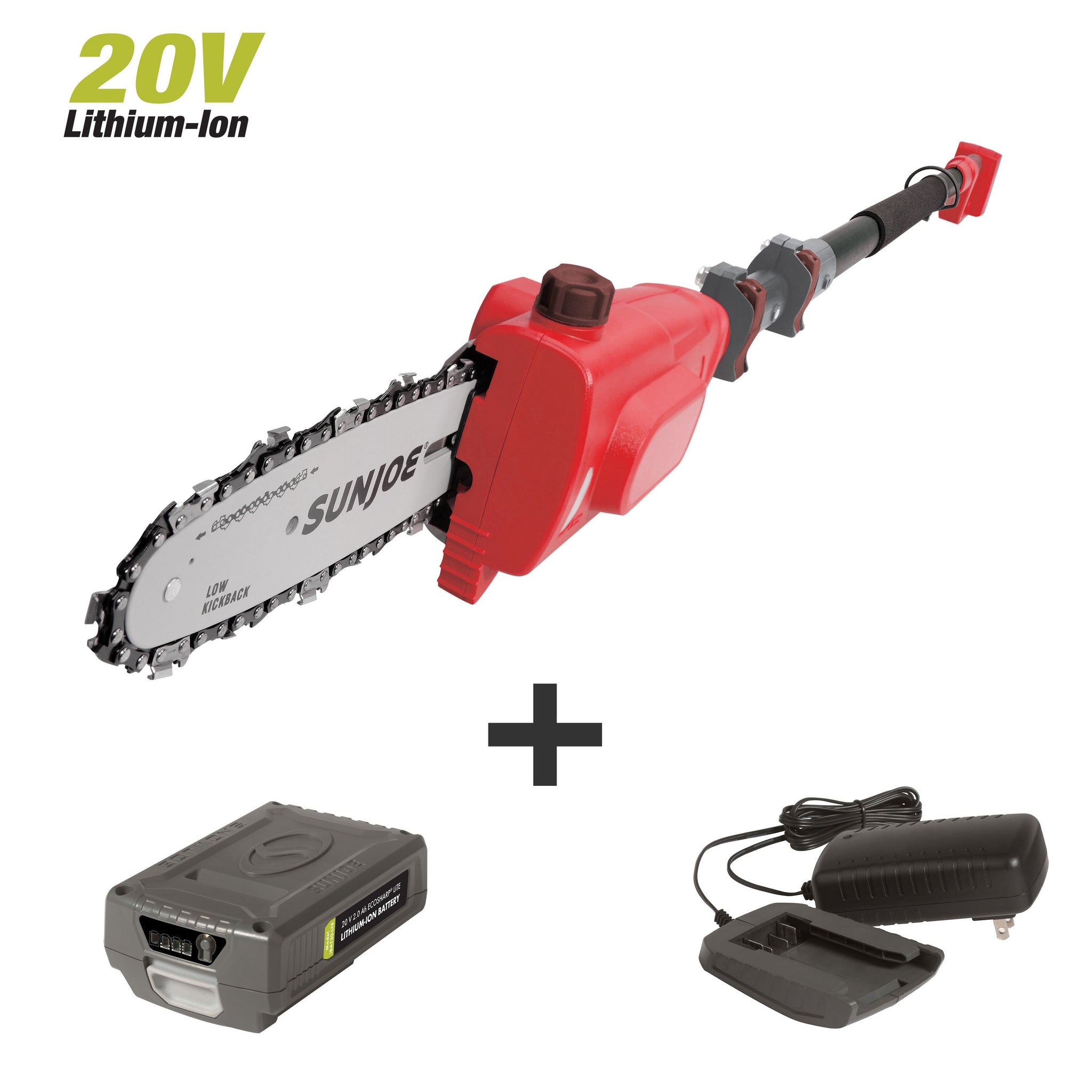 A CUT ABOVE THE REST. The Sun Joe 20ViONLT-PS8-RED cordless pole chain saw makes it quick and easy to trim your overgrown trees. Powered by the same interchangeable 20 V 2.5 Ah EcoSharp battery utilized by the other tools in the 20ViON series, the 20ViONLT-PS8-RED provides the cutting performance of a comparable electric-powered unit with the convenience and freedom of a lightweight (only 9.25 lbs!) cordless device.