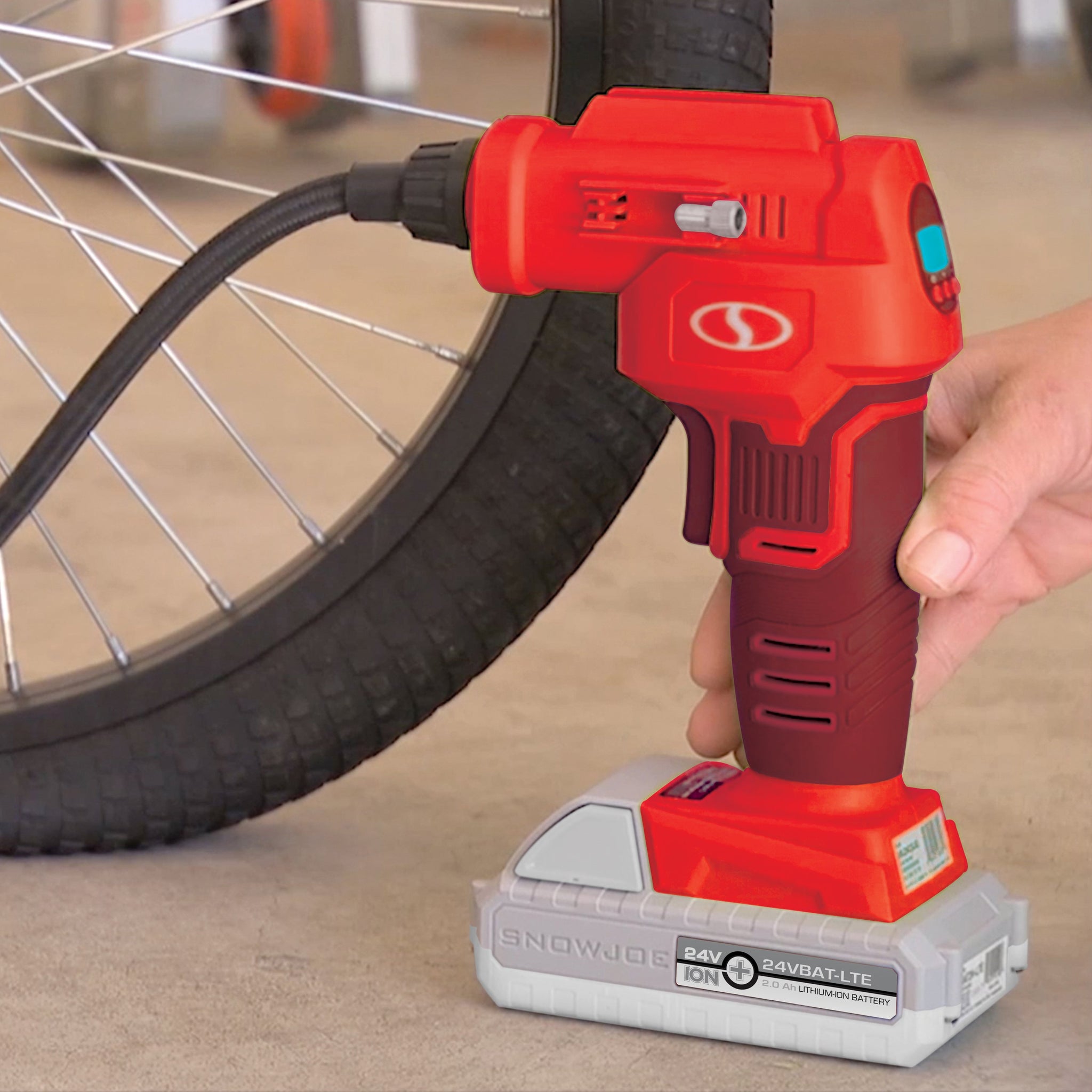 Skip the trip to the gas station and reach for the powerful portable air compressor that fits in the palm of your hand with the 24V-AJC-LTE 24-Volt Cordless Air Compressor from SUN JOE.