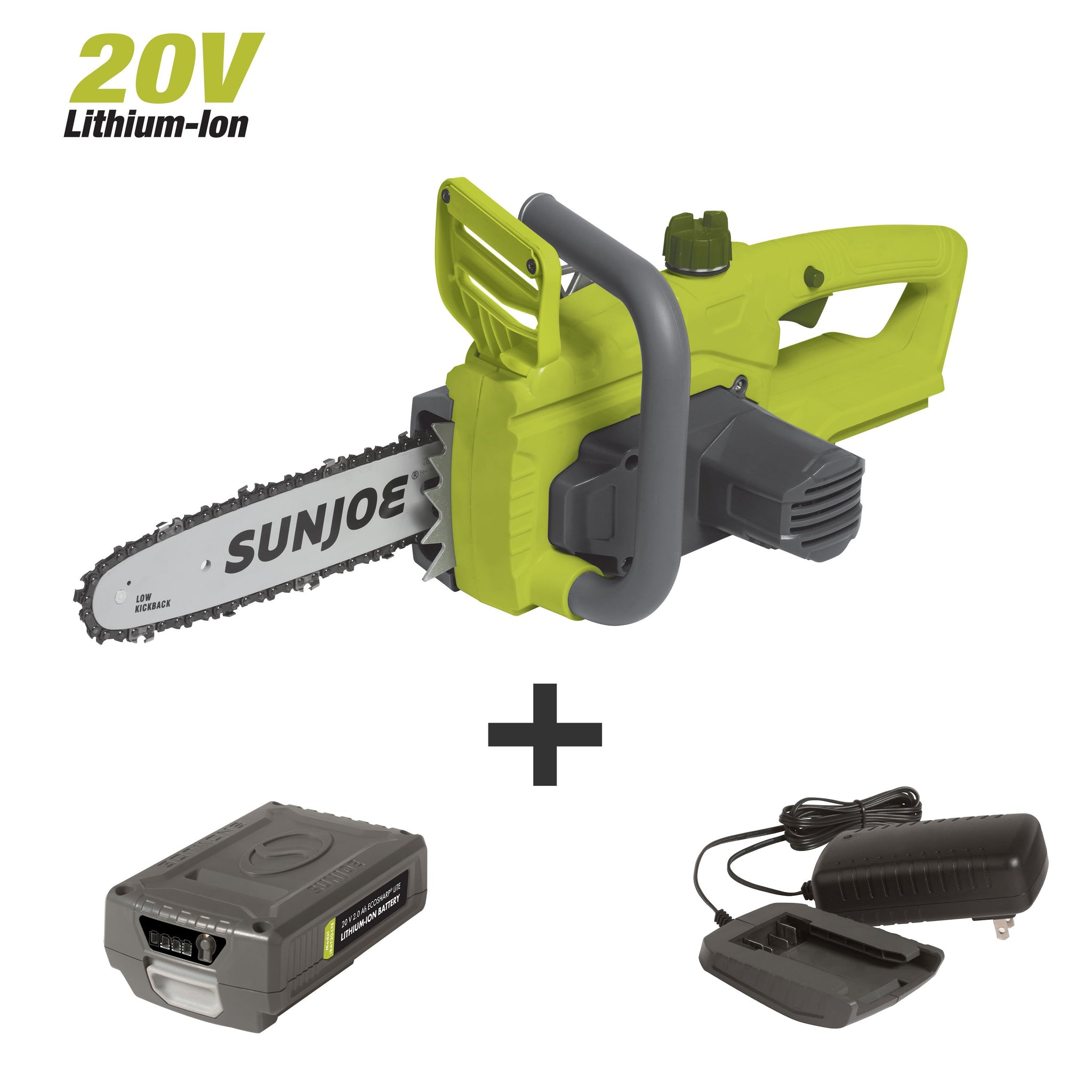 CUT DOWN TO SIZE. Lightweight and powerful, the iON 10" Cordless Chain Saw with battery plus charger features a durable, self-lubricating Oregon cutting bar and chain to cut branches, limbs and logs up to 9.5 inches thick. At the heart of iON is the long-life, rechargeable EcoSharp lithium-ion battery system, for reliable performance, season after season - and no carbon emissions for cleaner air. iON starts instantly with a simple push of a button and its ultra-lightweight, ergonomic design maximizes maneuverability and user comfort during use. Safety features include: hand guard with kick-back brake function, built-in safety switch to prevent accidental starts, sturdy aluminum handle, and protective sheath for safe storage.